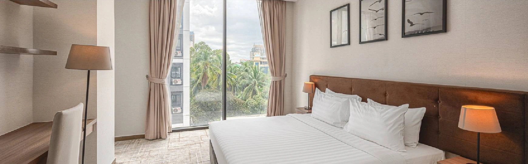 Enjoy apartment-style living with hotel comforts in the heart of BKK1. Every residence features a bright living room, a fully equipped kitchen and in-suite laundry ideal for short visits, business trips or extended stays. Most suites include a private balcony with city views.