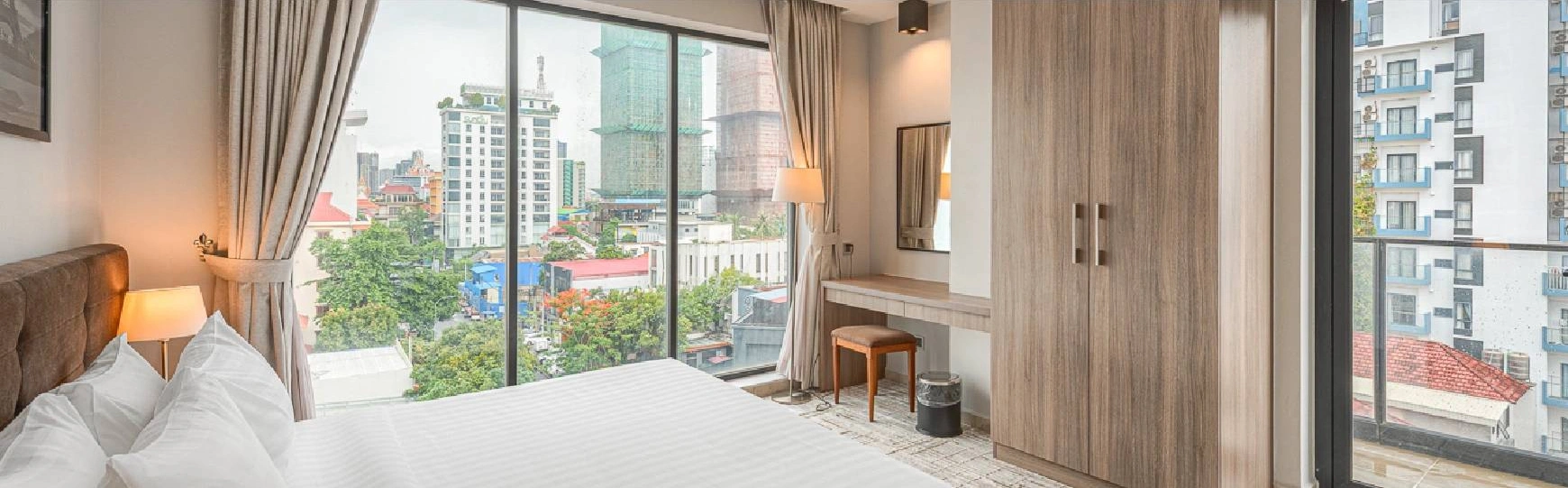 Enjoy apartment-style living with hotel comforts in the heart of BKK1. Every residence features a bright living room, a fully equipped kitchen and in-suite laundry ideal for short visits, business trips or extended stays. Most suites include a private balcony with city views.