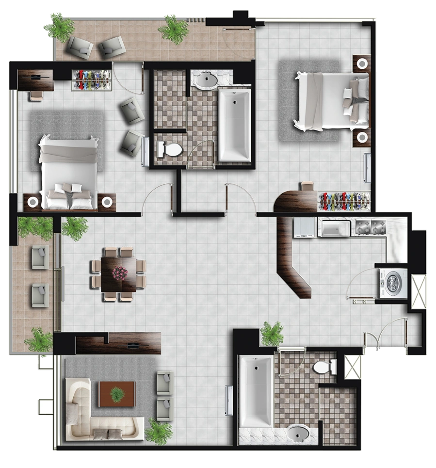 Designed for families or colleagues who appreciate privacy, the Two-Bedroom offers two separate sleeping rooms, a generous living/dining area and a full kitchen. Multiple bathrooms are available in select layouts; all units include in-suite laundry for week-to-week convenience.